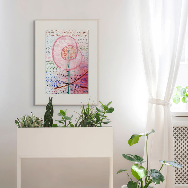 The composition is structured yet organic, with soft earthen tones and layered textures that hint at both botanical life and inner worlds. This museum-quality print preserves the nuance of Klee’s original painting, making it a striking and contemplative addition to any wall.