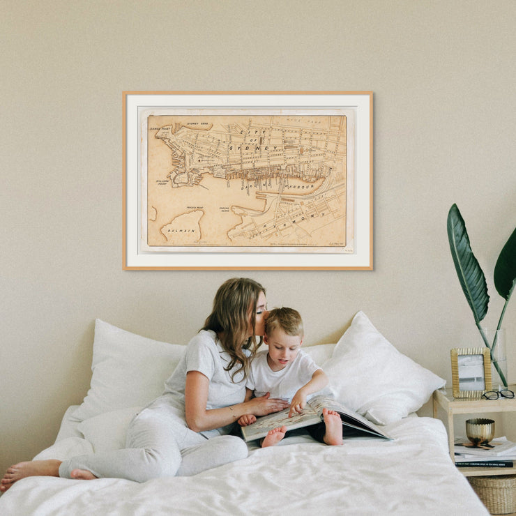 This vintage district map presents Darling Harbour and the Sydney CBD at the turn of the 20th century, when the harbour was firmly a working waterfront. Wharves, shipyards, and tightly arranged streets dominate the view, reflecting a city shaped by maritime trade and industry.