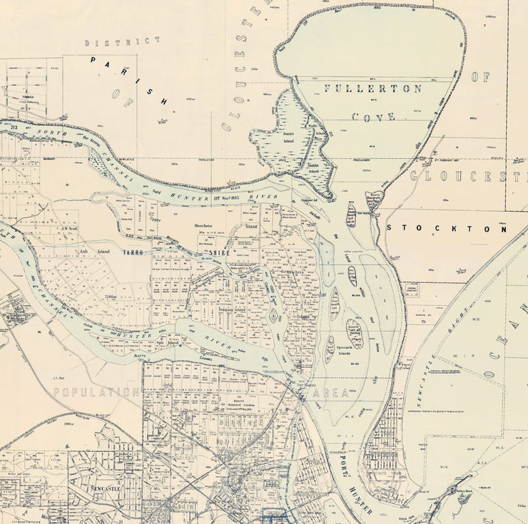 This 1908 map of Newcastle, NSW captures the city and its surroundings at a turning point in its history. Featuring the Parish of Newcastle, the winding course of the Hunter River, and the wide, undeveloped reach of Fullerton Cove, it presents the region before modern infrastructure reshaped the landscape.