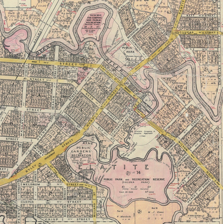 Situated at the junction of the Ovens and King Rivers, Wangaratta served as a key connection point between rural producers and larger trade routes. This map reflects the town’s early structure—before suburban expansion and infrastructure reshaped the area’s footprint—offering a glimpse into its formative years.