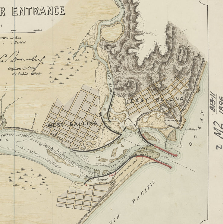 This 1896 map of the Richmond River Entrance offers a rare glimpse into the region’s early topography, drawn during a pivotal time when Ballina was beginning to emerge as a key coastal town. Capturing the winding course of the Richmond River and its surrounding landscape, this map showcases natural features and navigational routes that played a crucial role in the area’s development.